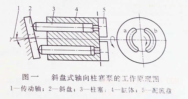 柱塞均勻布于缸體內,并且柱塞頭部靠機械裝置或在低壓油作用下緊壓在斜盤上。斜盤的法線或缸體軸線的夾角為斜盤傾角Y.當傳動軸按圖示方向旋轉時,柱塞一方面隨缸體轉動,另一方面還在機械裝置和低壓油的作用下,在缸體內往復運動,柱塞在其下面的半圓周內旋轉時逐漸向外伸出,使缸體內孔和柱塞形成的密封油腔容積不斷增加,油腔內形成負壓,從而將油液經配流盤的吸油口a吸入;柱塞在其自下而上的半圓周內旋轉時又逐漸被壓入缸體內,使密封油腔容積不斷減小,將油液從配油盤窗口b向外壓出。缸體每轉一周,每入缸內,使密封油腔容積不斷減小,將油液從配油盤窗口b向外壓出。缸體每轉一周,每個柱塞往復運動一次,完成一次吸油和壓油。