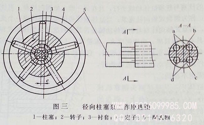 轉子順時針方向轉動時,柱塞在離心力(或在低壓油)的作用下壓緊在定子4的內壁上,當柱塞轉到上半周,柱塞向外伸出,徑向孔內的密封油腔容積不斷增大,產生局部真空,將郵箱中的油液經配流軸上的a孔進入b腔;當柱塞轉到下半周,柱塞被定子的表現向里推入,密封工作容積不斷減小。將c腔的油從配流軸上的d孔向外壓出。轉子每轉一轉,柱塞在每個項向孔內吸、壓油各一次。改變定子與轉子偏心量e的大小,就可以改變泵的排量;改變偏心量e的方向,既當偏心量e從正值變為負值時,泵的吸、壓油方向發生變化。因此頸向柱塞泵可以做成單向或雙向變量泵。