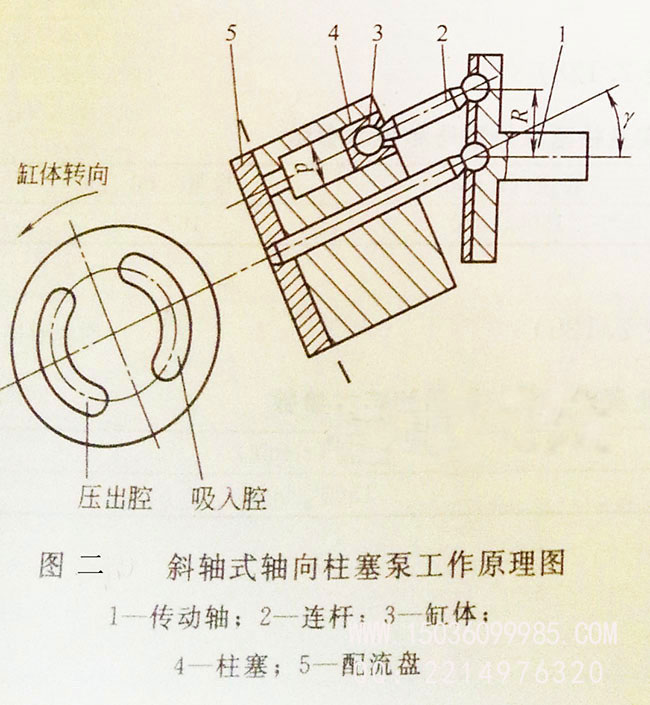 圖二所示為斜軸式軸向柱塞泵工作原理圖。當傳動軸1在電動機的帶動下轉動時,連桿2推動柱塞4在缸體3中作往復運動,同時,連桿的側面帶動柱塞連同缸體一同旋轉。配流盤5固定不動,盤上有兩個窗口,泵利用這兩個窗口進行吸油和壓油。若改變缸體的傾斜角度r,就可改變泵的排量;若改變缸體的傾斜方向,就可成為雙向變量軸向柱塞泵。